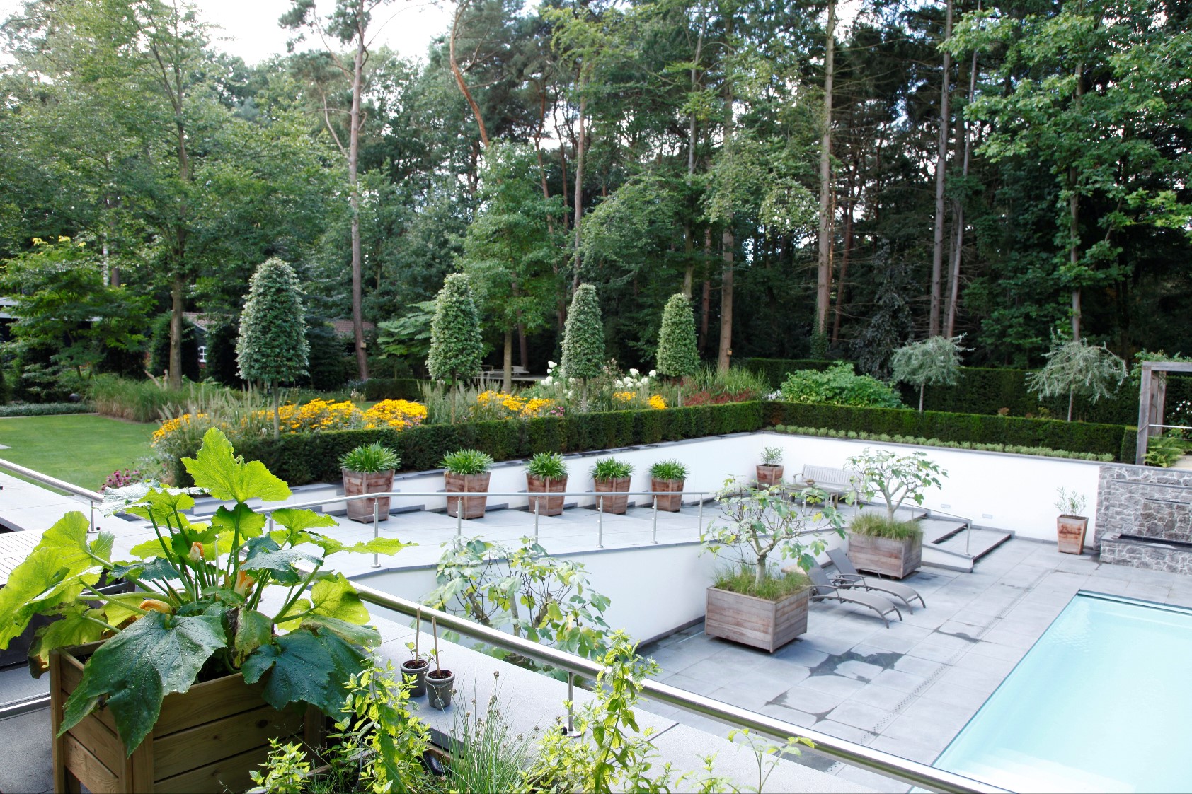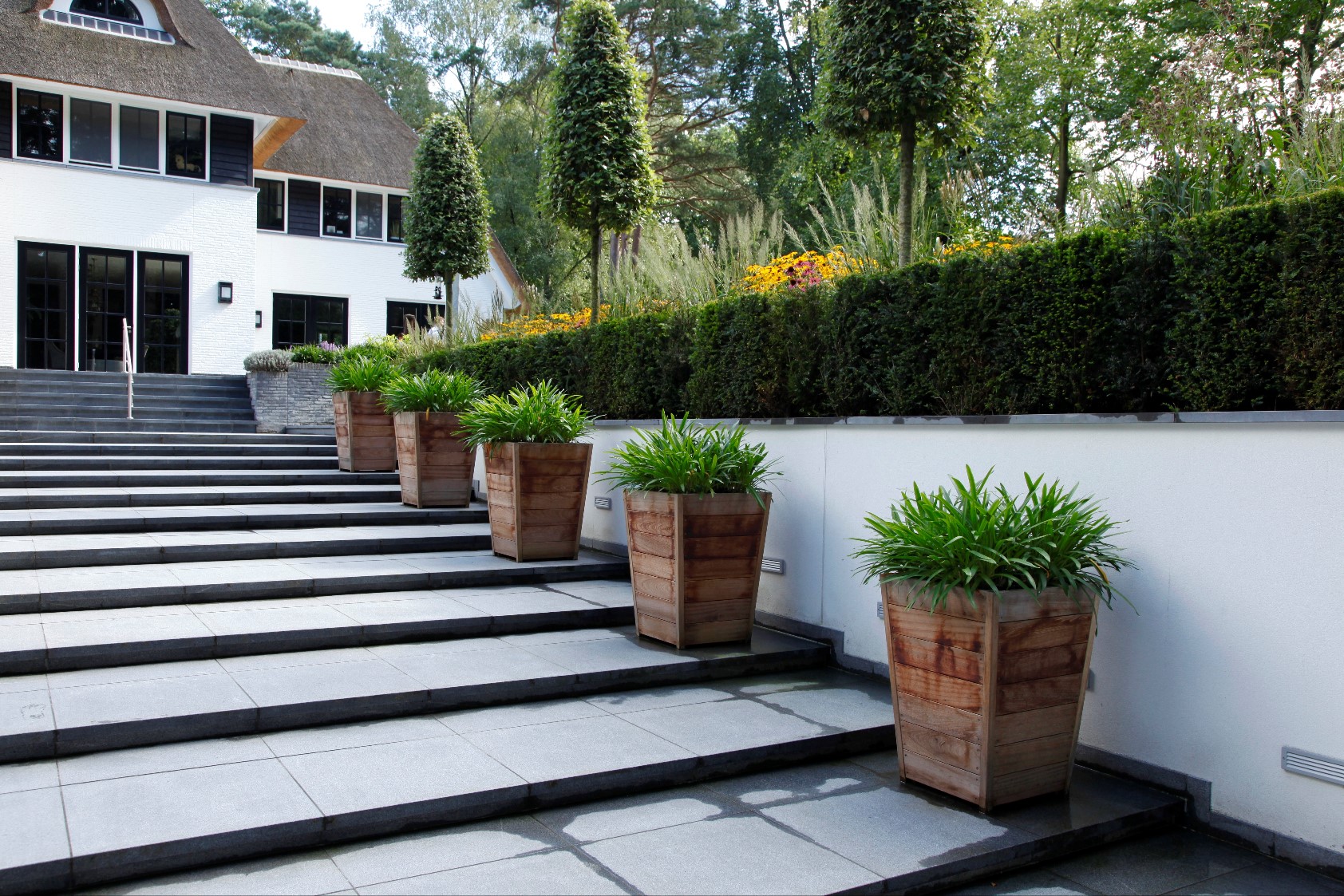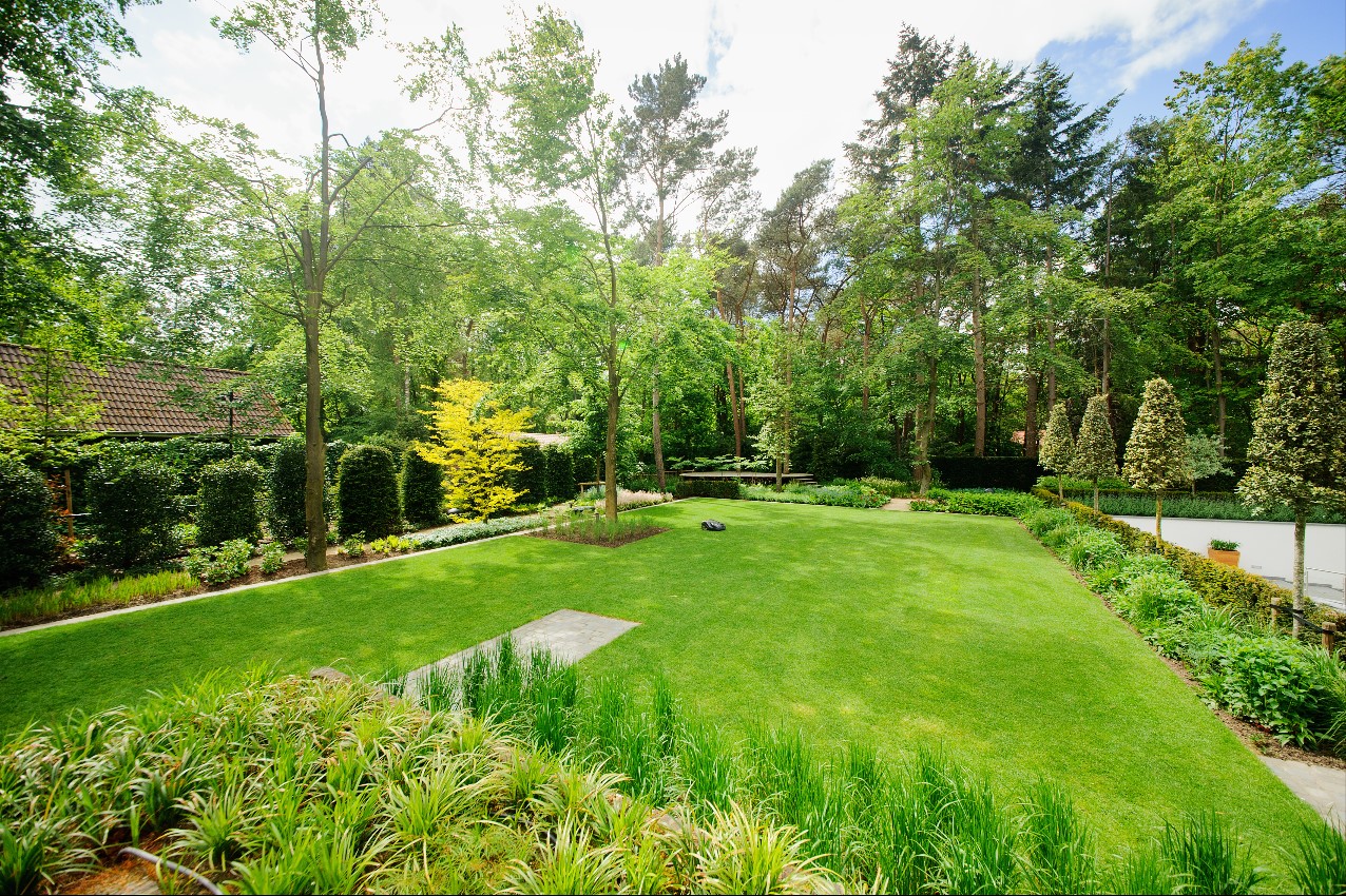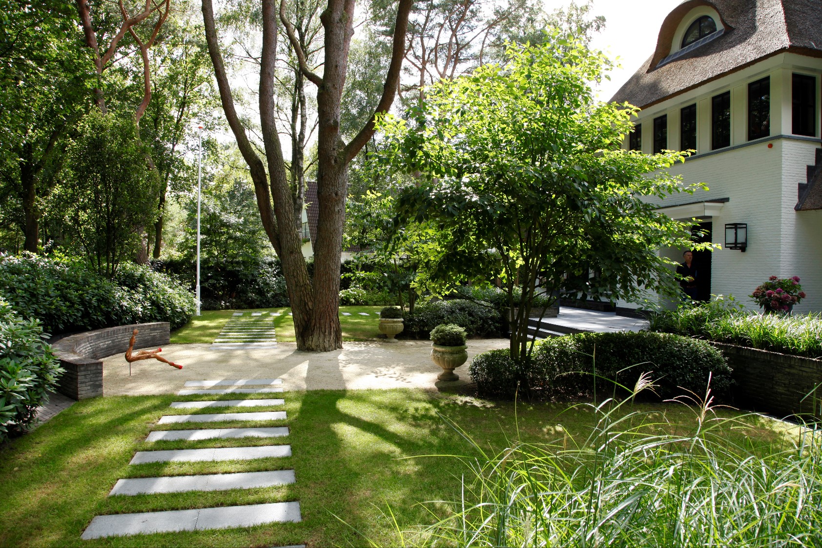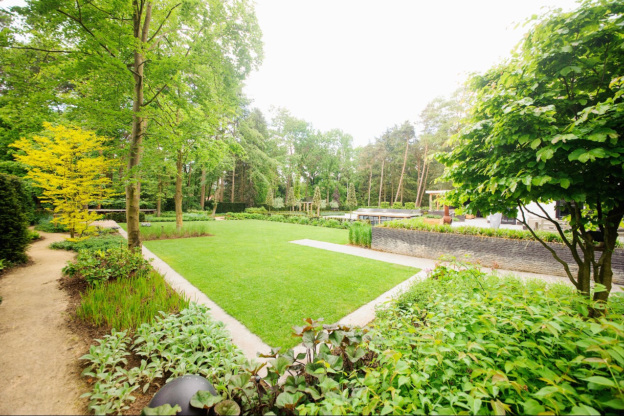 In een lommerijke wijk op de Veluwe heeft deze villa een prachtige aankleding gekregen. Door te werken met volwassen beplanting in de vorm van grote bomen is een tuin met 'body' gecrëerd. In goede harmonie met de omgeving, mede door de vele bomen die we cadeau kregen, is een ontwerp gemaakt. Dit ontwerp kenmerkt zich door een krachtige lijnvoering, waarbij de woning goed tot zijn recht komt. In 2017 hebben wij voor deze tuin de prijs gekregen voor de beste tuin van Nederland.