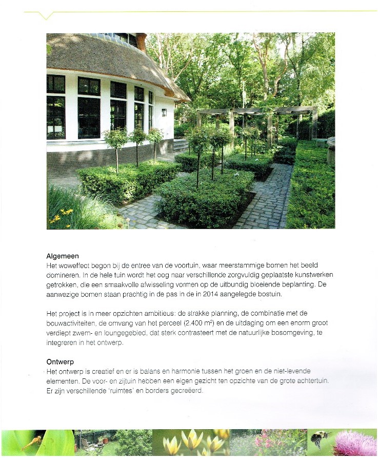 Feit is dat we wonnen, de eerste de beste keer dat we meedongen. We zijn er nog steeds trots op, maar we maken elk jaar wel een aantal tuinen om in te lijsten, die misschien wel net zo goed zijn als deze. Toch heeft die vakprijs ons vleugels gegeven en het zelfvertrouwen versterkt: geen mooier compliment dan dat van collega’s, toch?